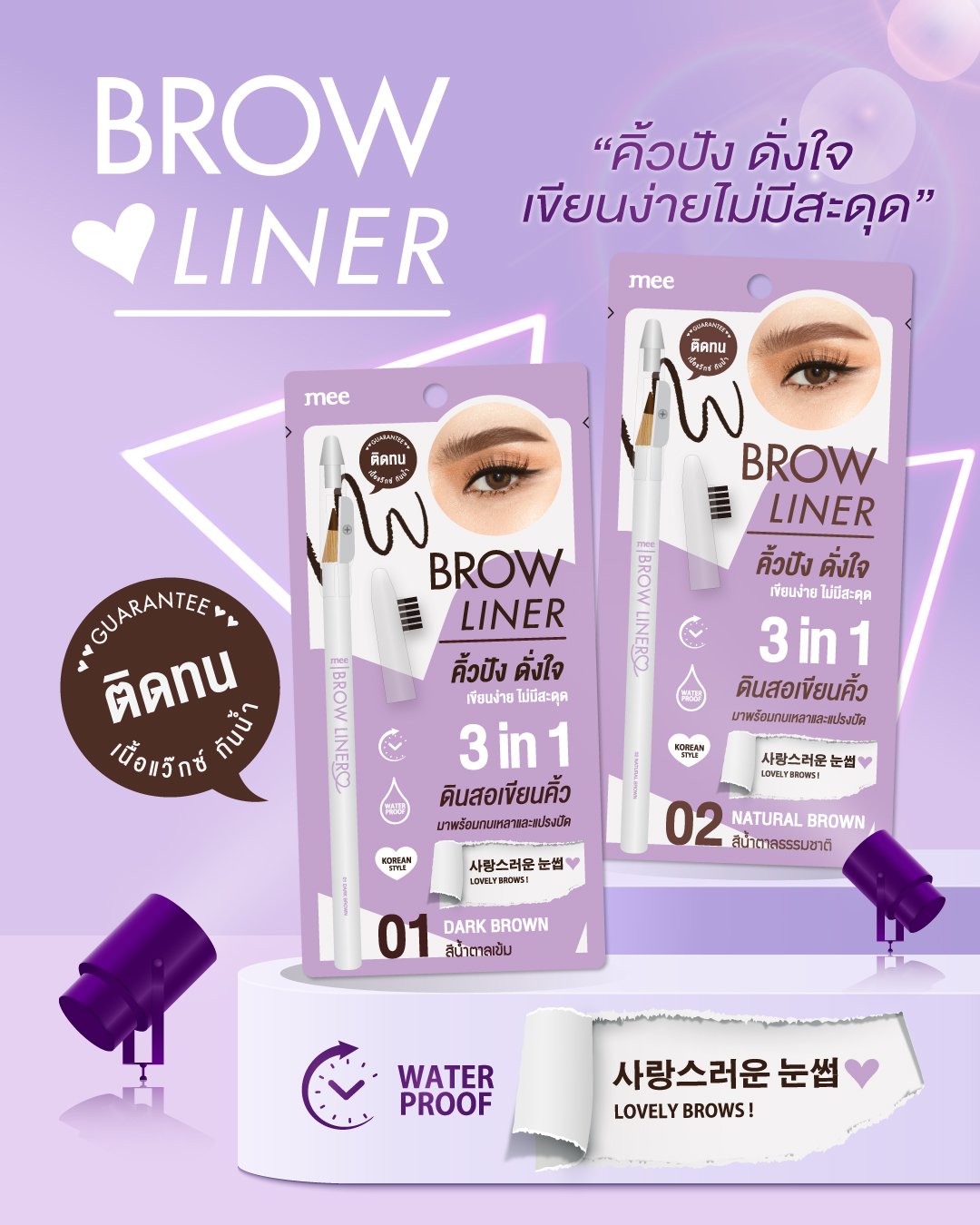 ป้ายยาดินสอเขียนรุ่นดินสอไม้ MEE BROW LINER ดินสอเขียนคิ้ว แบบแท่งไม้ เนื้อแว๊กซ์ นุ่ม เขียนง่าย เขียนโครงคิ้วได้ชัด มาพร้อมกบเหลา และแปรงปัดขนคิ้วในตัว เขียนหัวคิ้วเรียงเส้นสวย ตวัดปลายหางคิ้วคมชัด สวยครบในแท่งเดียว กันน้ำ กันเหงื่อ ติดทนยาวนานตลอดวัน